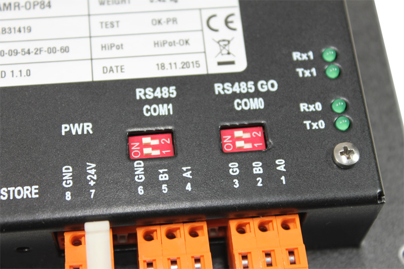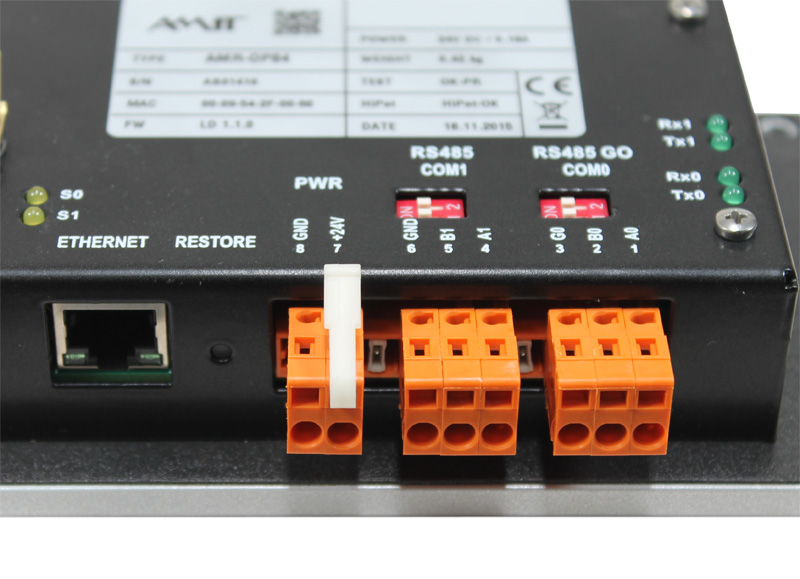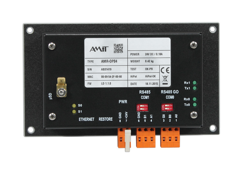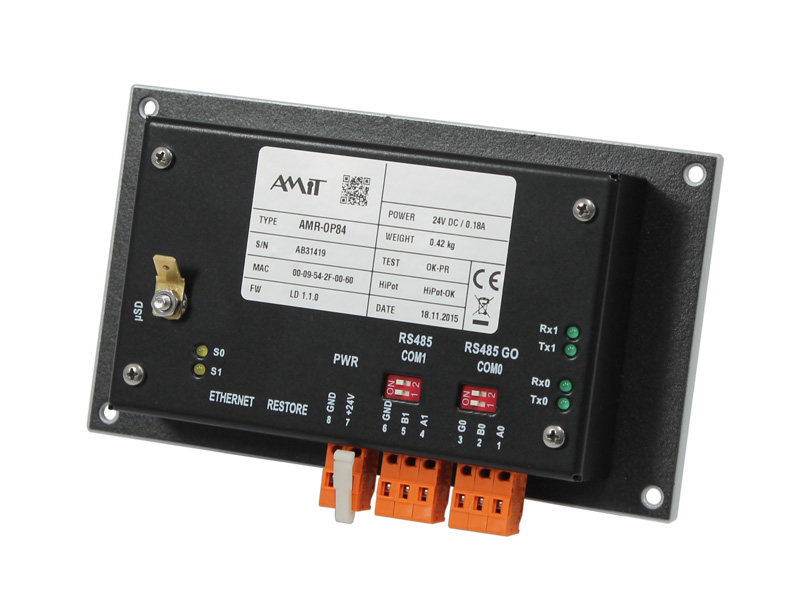 A HMI szabványos Ethernet interfésszel és két RS485 sorral rendelkezik. Az AMR-OP87/G verzió beépített GSM modemet tartalmaz riasztás/ parancs küldésére SMS-ben.