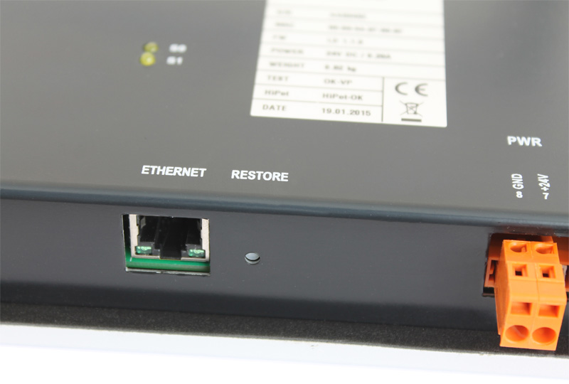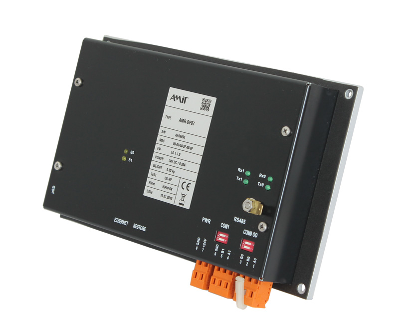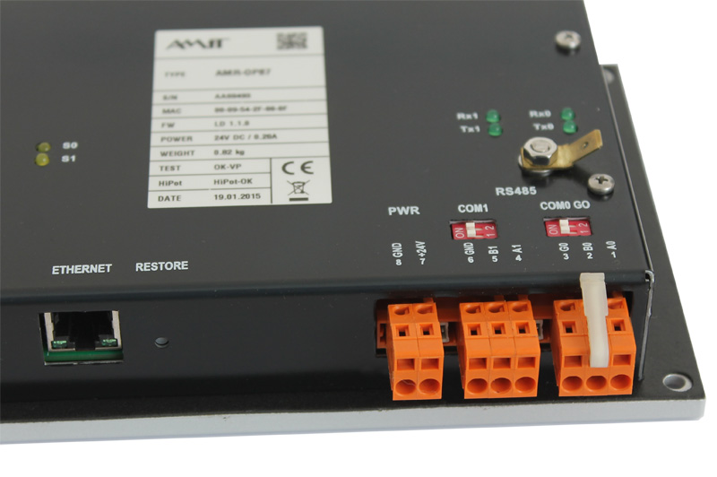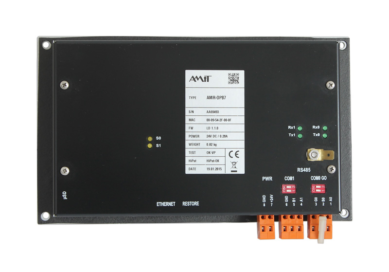 A HMI szabványos Ethernet interfésszel és két RS485 sorral rendelkezik. Az AMR-OP87/G verzió beépített GSM modemet tartalmaz riasztás/ parancs küldésére SMS-ben.
