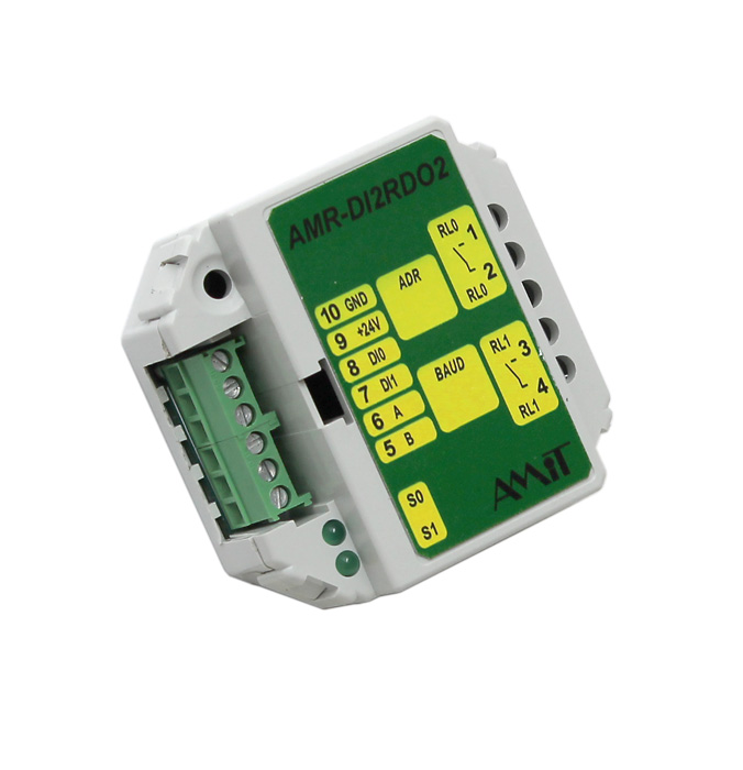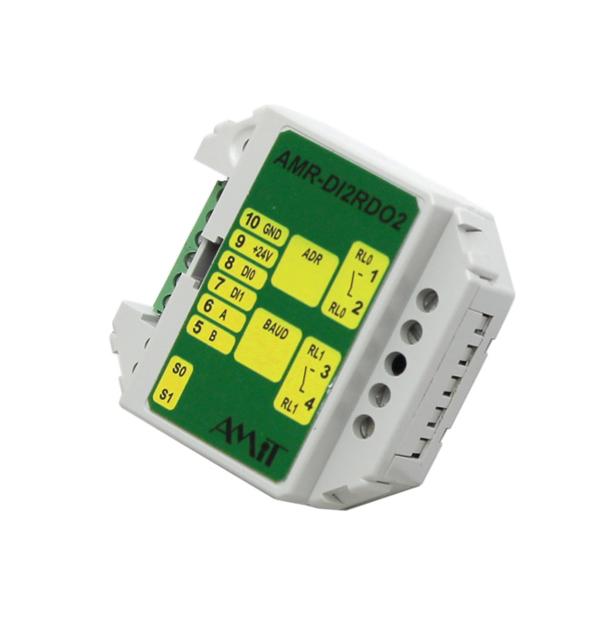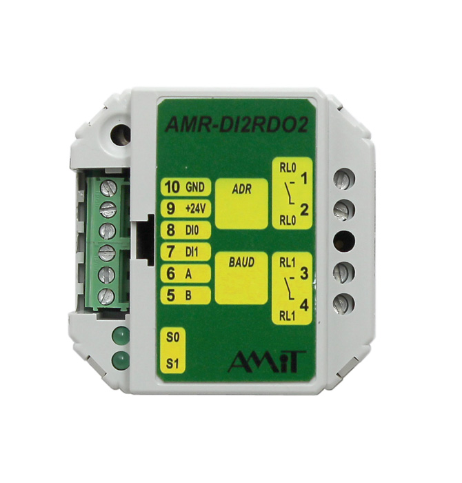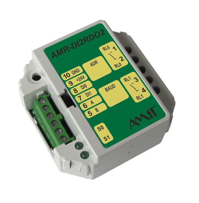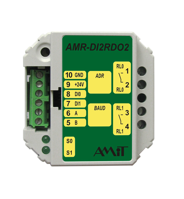 Az AMR-DI2RDO2 nem csak I/O modul, hanem programozható vezérlő is egyszerre. Több kapcsolóval összekötve képes ellátni a lokális vezérlési feladatokat, amikre a RS485 kommunikáción keresztül a központi vezérlőrendszer utasítja.