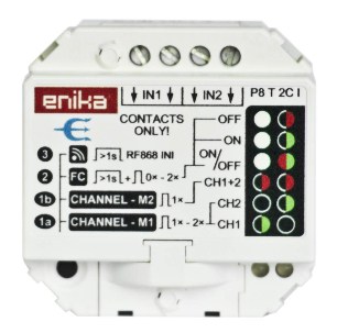 Elemmel működő, bemeneti adat továbbításra készült eszköz, ami kis mérete miatt könnyen a kapcsolódobozokba, kapcsoló mögé szerelhető (mélyített kötődoboz esetén). Segítségével a meglévő hagyományos kapcsolók vezetéknélküli kommunikációval képesek vezérelni más ENIKA-s modulokat.